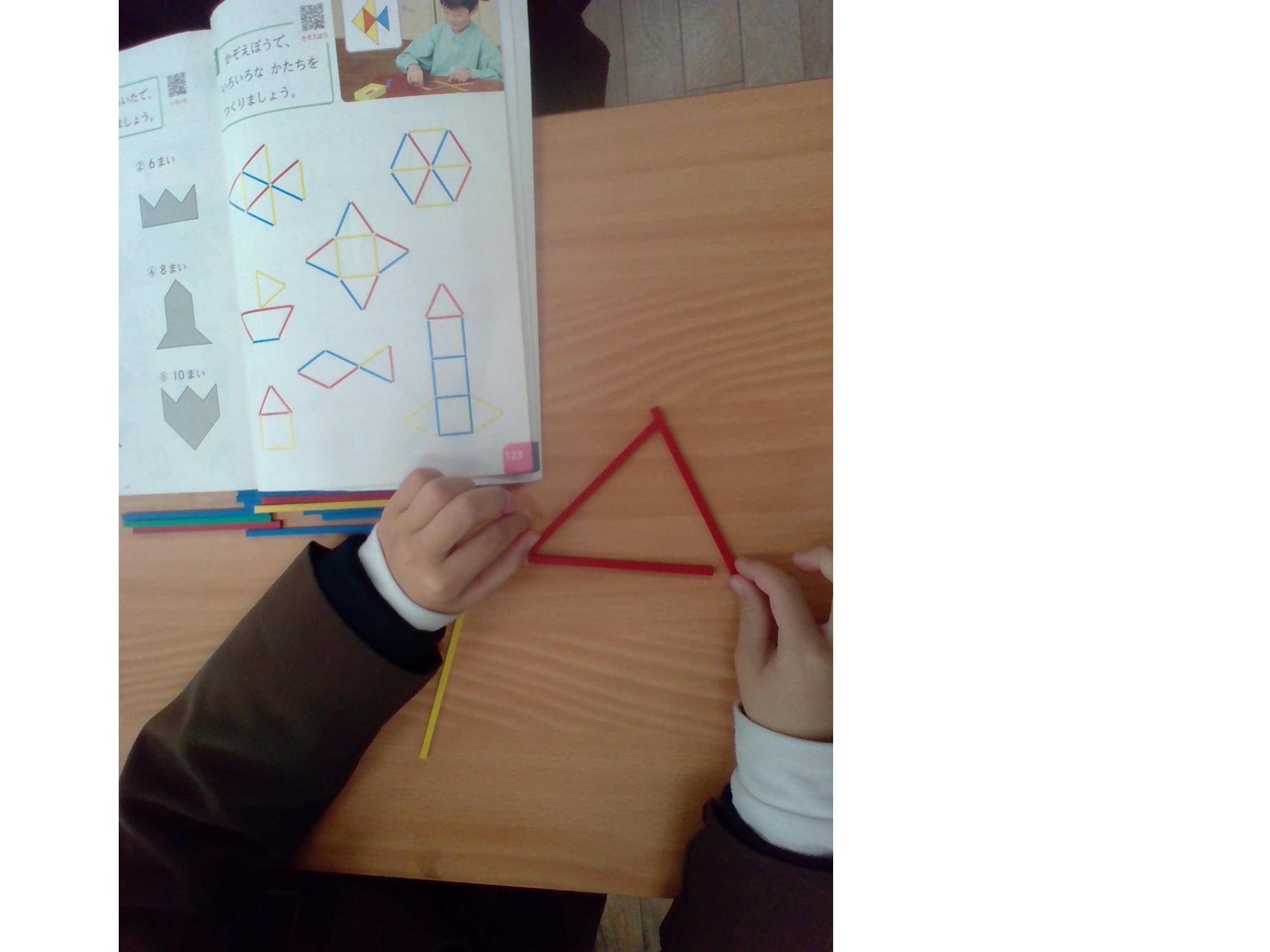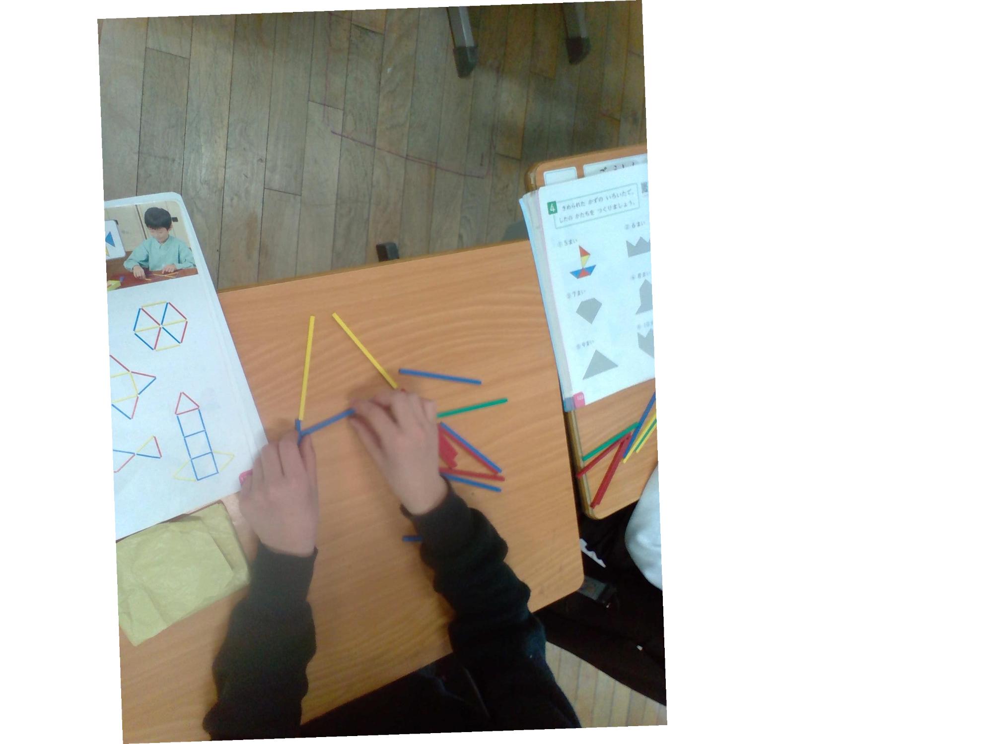 1年生は、上の学年で自分で学べるようになることを目標にしています。今は、クラス全体で、45分の授業をどのように進めていくかを少しずつ積み重ねています。算数では「かたちづくり」の学習をしました。練習では、自分のペースで問題にとりくんでいきました。