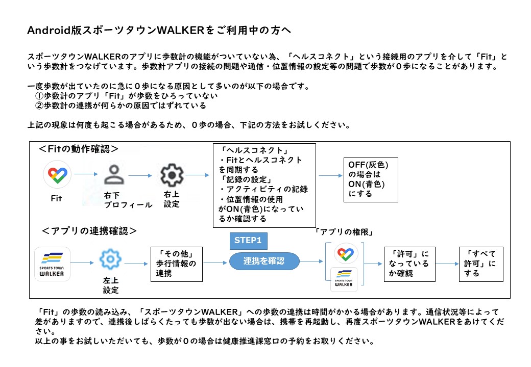 - 各アプリ(スポーツタウンWALKER、Google Fit、ヘルスコネクト)のアップデートができているか