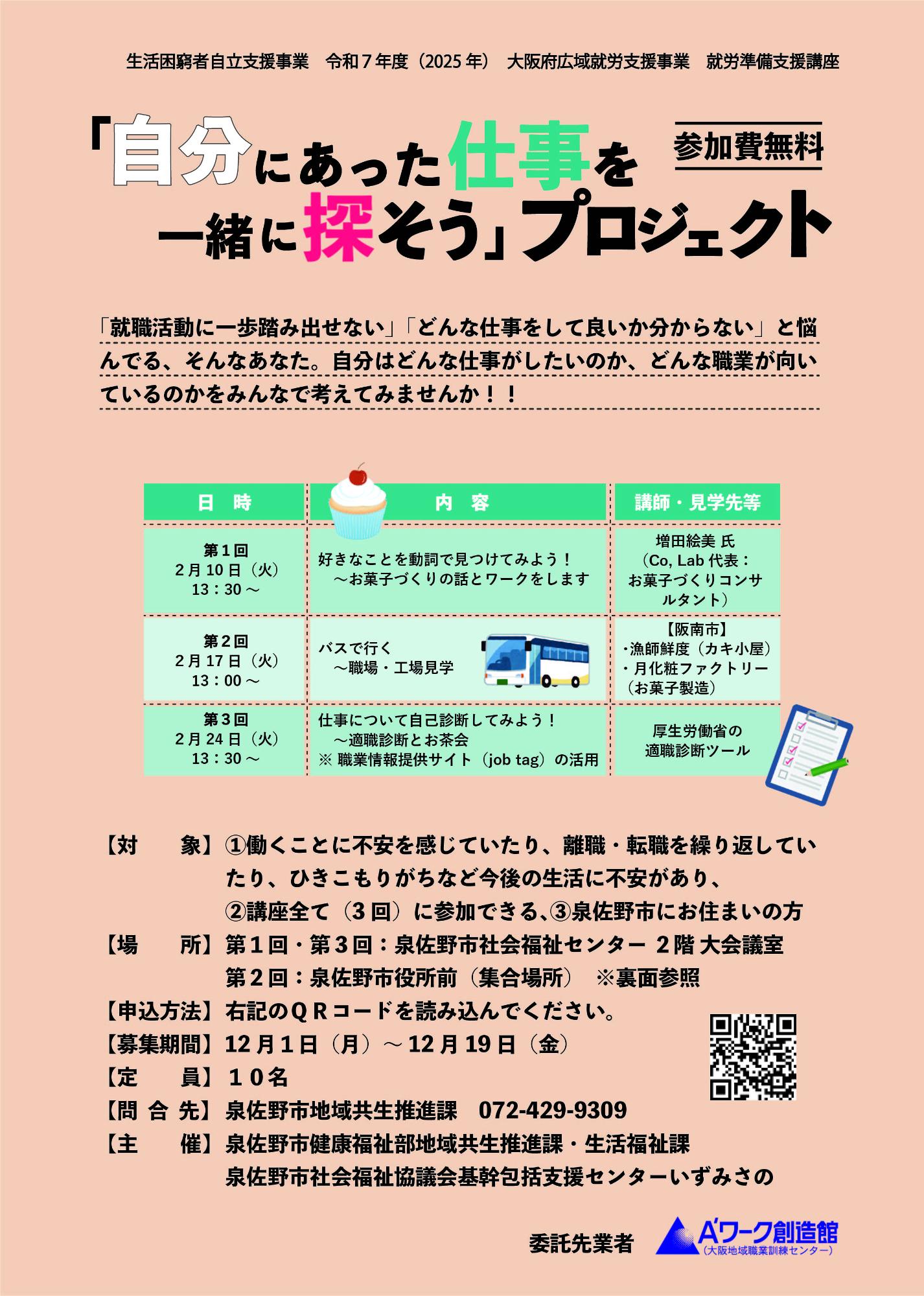 対象:泉佐野市にお住まいで、働くことに不安を感じている、離職・転職を繰り返している、ひきこもりがちなど今後の生活に不安のある方。