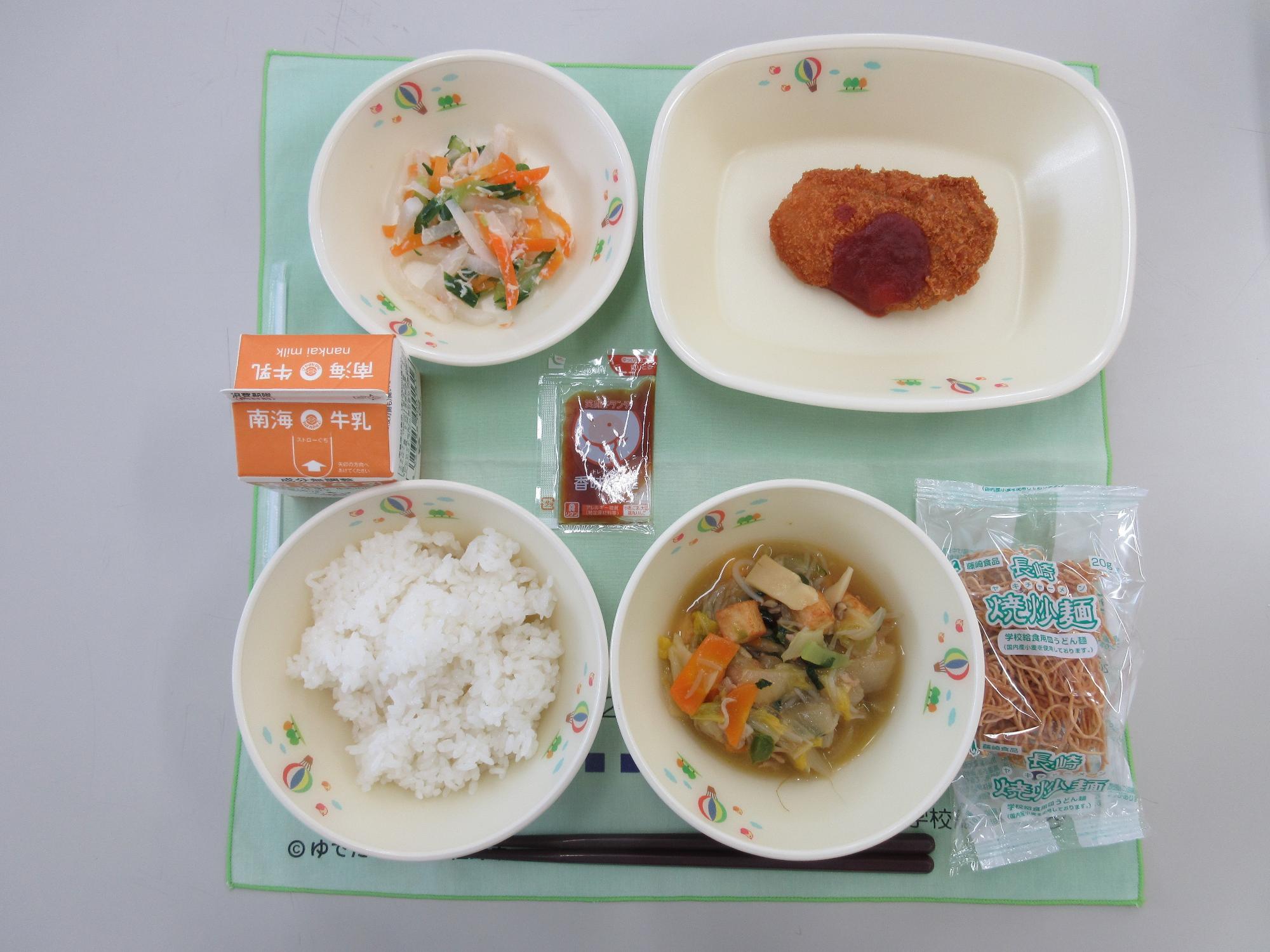 3月18日 牛乳 ごはん 皿うどん 白身魚フライ 大根サラダ