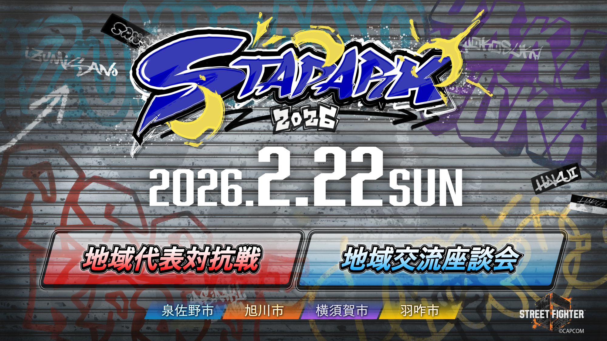 2026月2月22日(日曜日)に「eスタジアム泉佐野」にて、泉佐野市・旭川市・横須賀市・羽咋市が共催するストリートファイター6イベント『スタパーク』を開催いたします!
