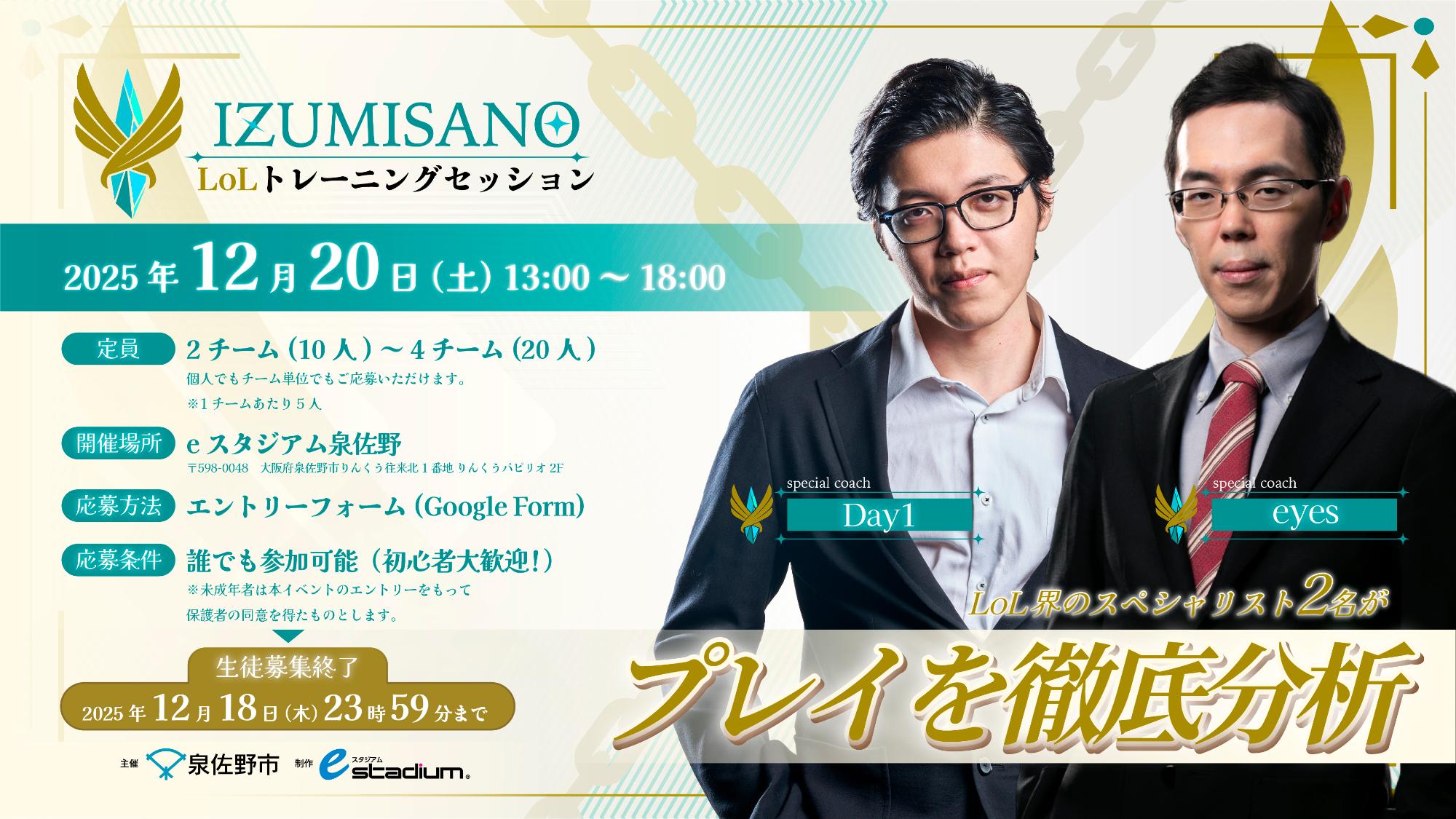 2025年12月20日(土曜日)に「eスタジアム泉佐野」にて、LoLコーチングイベント『いずみさのLoLトレーニングセッション』を開催いたします!