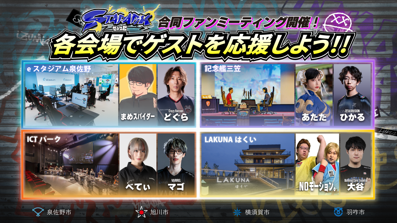 2026月2月22日(日曜日)に「eスタジアム泉佐野」にて、泉佐野市・旭川市・横須賀市・羽咋市が共催するストリートファイター6イベント『スタパーク』を開催いたします!