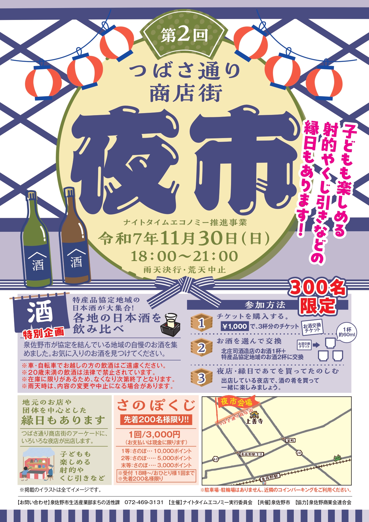 第2回つばさ通り商店街「夜市」は、泉佐野市と特産品相互取扱協定を結んでいる日本各地の自治体のお酒が飲めるイベントです。お気に入りのお酒を見つけてください!