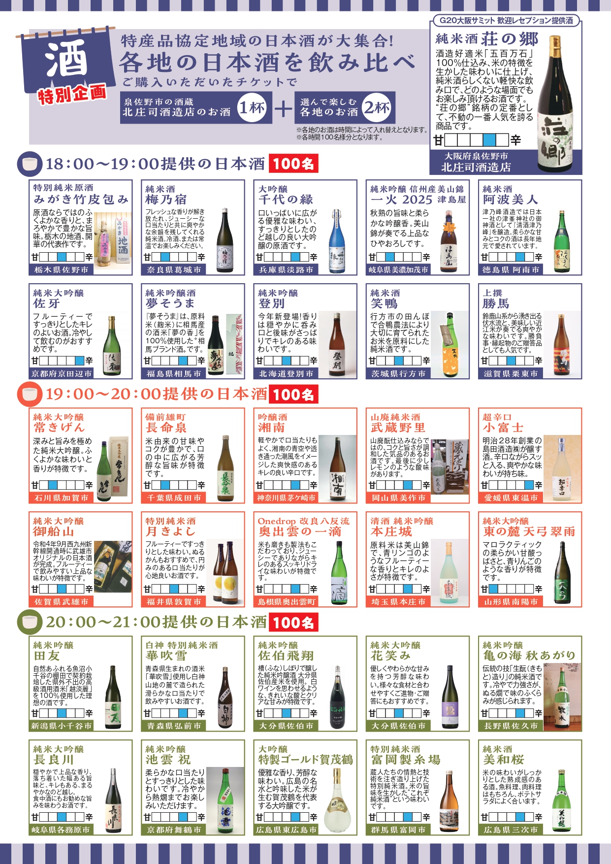 ご購入いただいたチケットで、泉佐野市内の唯一の酒蔵「北庄司酒造店」のお酒(1杯)+各地のお酒(2杯)が楽しめる!