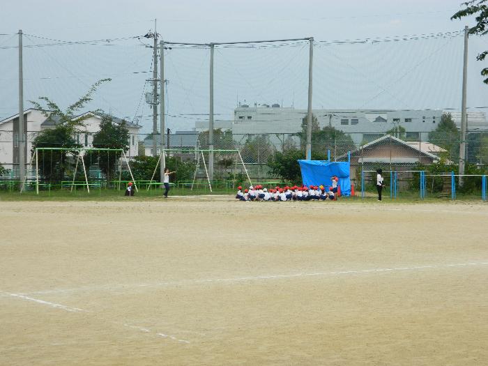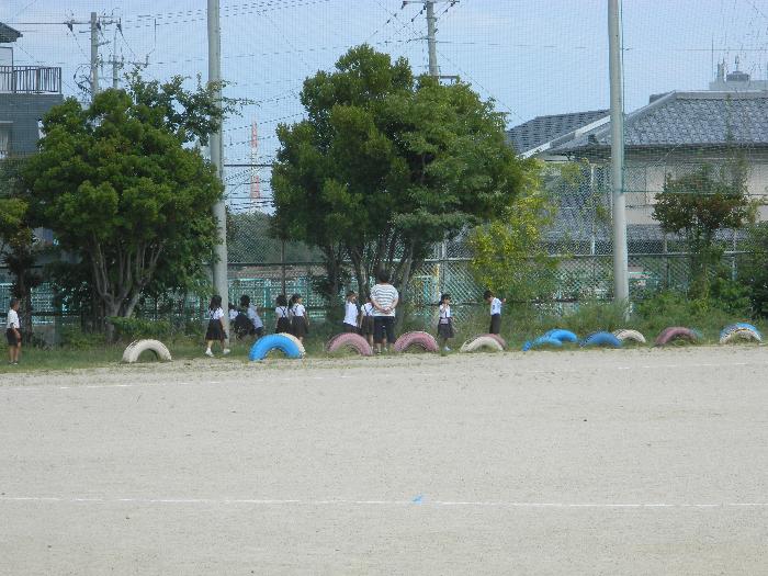 2年生体育の時間。気温が少しマシになってきました。砂場で幅跳びに取り組んでいました。
