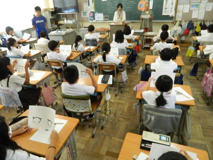 2年生国語の授業。学校公開に向けての授業が進んでいます。プリントの「けん玉のつくり方」を読んで、教科書の「紙コップ花火のつくり方」との共通点、わかりやすくする工夫を見つけていました。