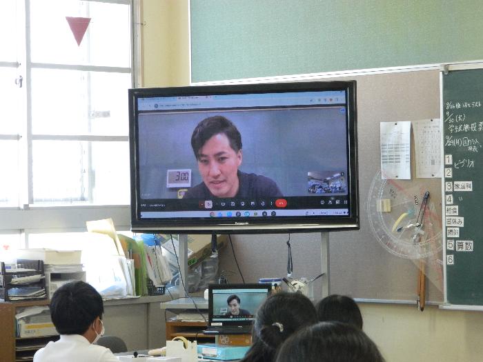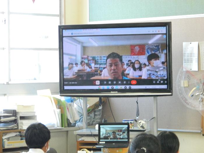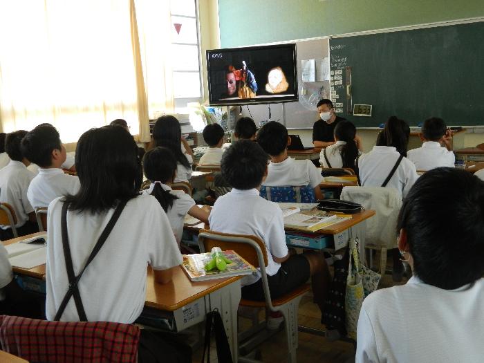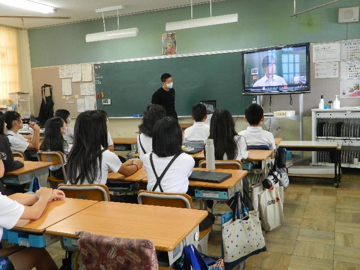 6年生社会の授業。NHKの学習ビデオを観ながら、日本の伝統芸能、能について学習していました。
