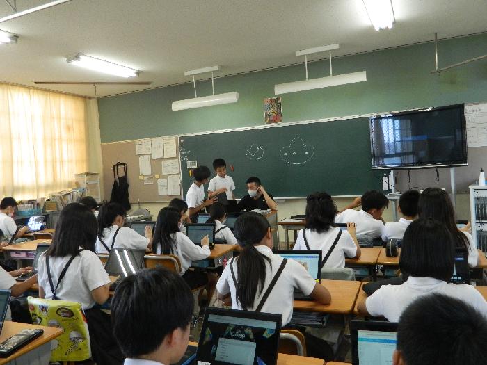6年生総合の時間。日本の伝統文化について学習しています。市役所の国際交流員さんに日本の文化を伝えるテーマをグループで決めていました。和菓子、和室、日本のお城等いろんなテーマが挙がっていました。