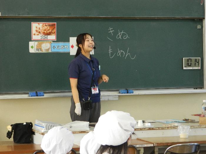 大阪生協から講師先生に2人来ていただき、3年生は豆腐作り体験をしました。豆腐についての説明の後、準備された豆乳ににがりを混ぜて豆腐を作っていました。試食もしてみました。原料の大豆は畑のお肉といわれています。たくさん食べてくれたらと思いました。貴重な経験ができました。ありがとうございました。