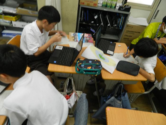6年生国語の授業。自分が選んだ日本の伝統文化を説明する資料を作成しています。グループでの推敲を経て、最後の仕上げにかかっていました。