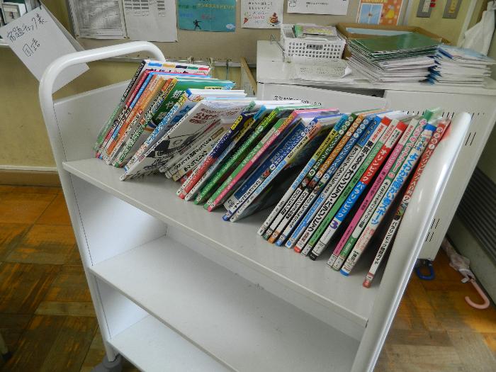 4年生図書の時間。5,6年生が取り組んでいたビブリオバトルに挑戦です。おすすめ本を紹介する手順を、司書の先生から説明を受けていました。