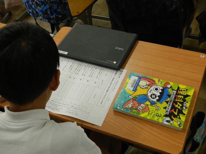 4年生総合の時間。「3年生のおすすめ本をしょうかいしよう」をめあてに取り組んでいます。自分が薦める本の情報を思考ツール上の付箋に書き出し、「魚の骨」のツールに分類整理して貼り付けていました。分類は「くわしい情報」「おすすめポイント」等4つに分けてありました。