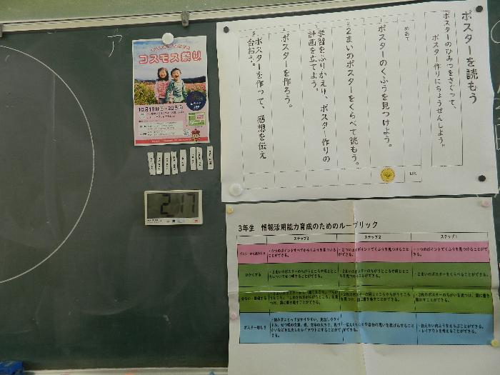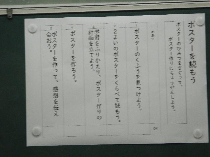 3年生国語、総合の授業。「ポスターを読もう」の単元を取り組みます。まず教科書のポスターの例から、くふうされているところを見つけることから始めていました。