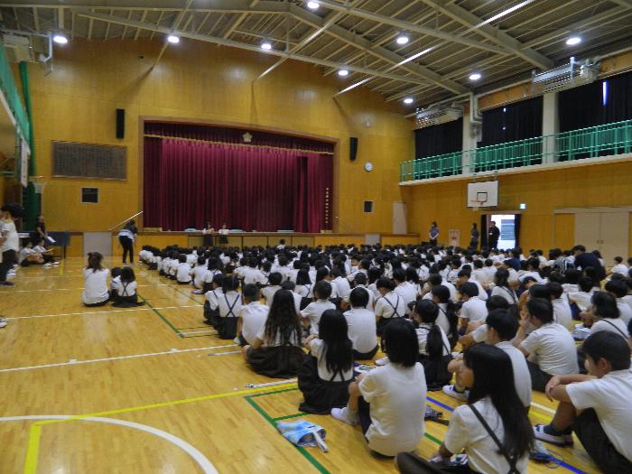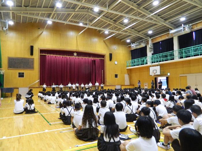 9月になりました。今日は朝体育館に集まって児童朝会がありました。校長先生のお話。生活指導の先生のお話。身なりを整え、規則正しい生活をするように、との話でした。読書通帳が100冊たまった児童の表彰もありました。また、教育実習生が1名、中央小学校に配置されます。仲良くしてほしいです。