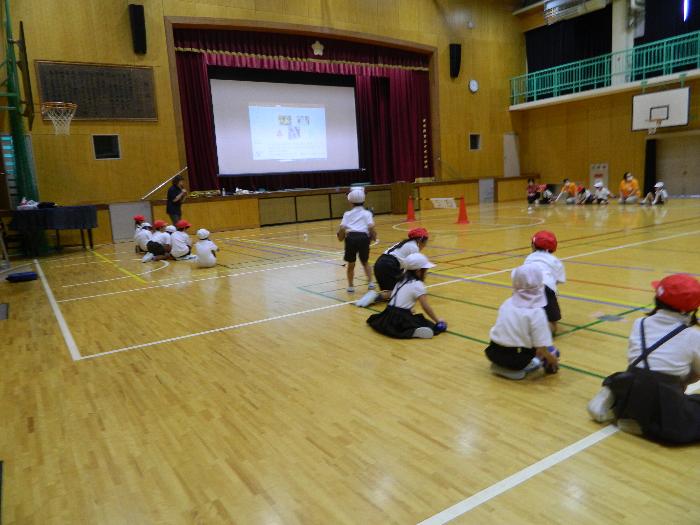 ふれあいの子どもたちは体育館に集まっていました。防災の日にちなんで、災害についてスライドを観ながらみんなで考えていました。