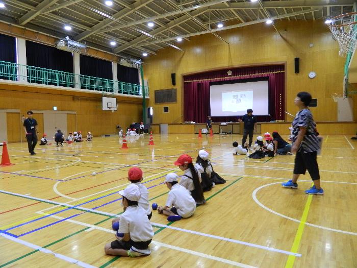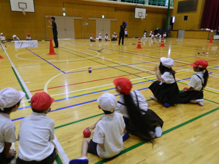 1年生はクラス単位で体育館に入り、ボッチャを体験していました。指導者、サポーターの方に来ていただき、丁寧に説明を受けました。ゲームが始まると子どもたちは熱中して取り組んでいました。楽しそうです。