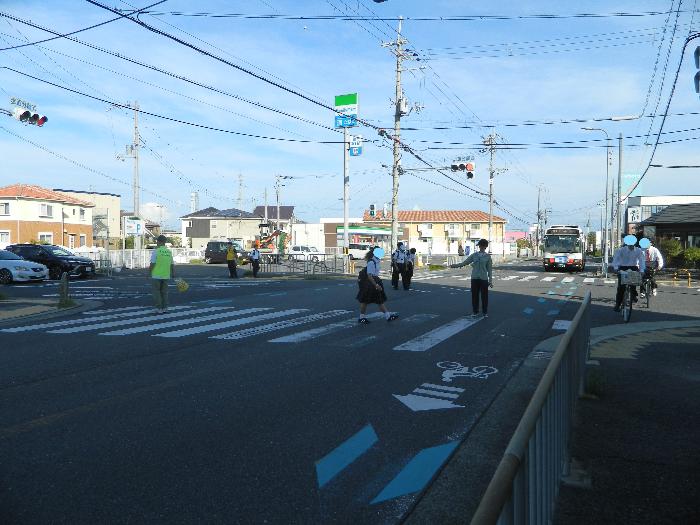全国交通安全週間に合わせて、いつも子どもの見守りをしていただいているボランティアの方々と一緒に、先生方も交差点に立って安全指導を行っています。子どもたちには、安全に登下校してほしいです