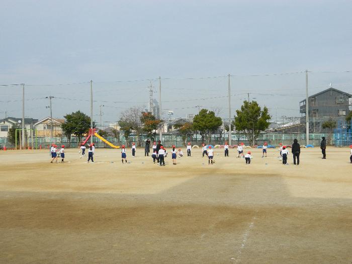 1年生体育の時間。運動場でサッカーの練習です。楽しそうでした。