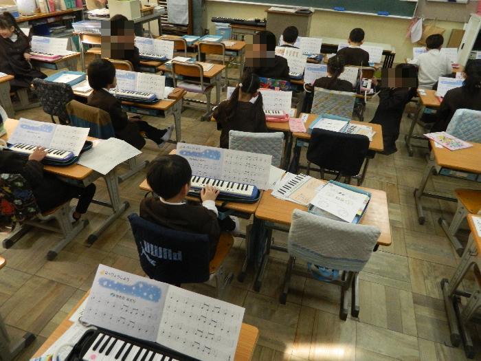 1年生音楽の時間。鍵盤ハーモニカを練習していました。「ふゆのけしき」雪がふっている様子をあらわした曲です。楽しそうです。