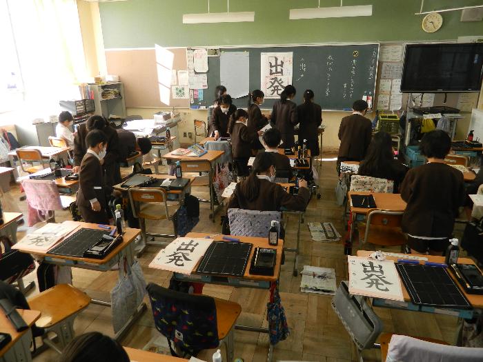 4年生書写の時間。毛筆で「出発」を書きました。力強い字で書けていました。