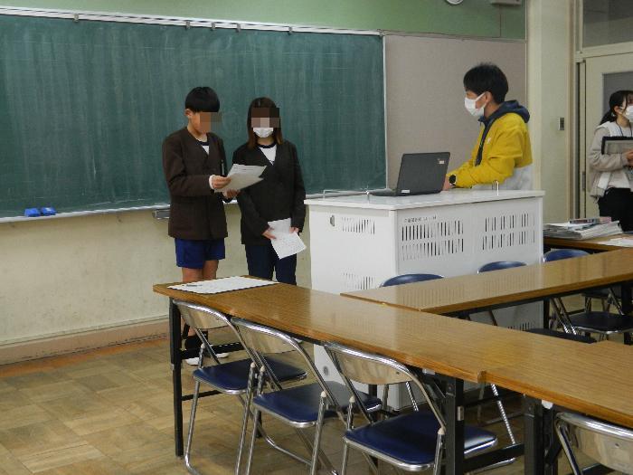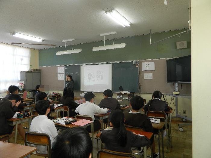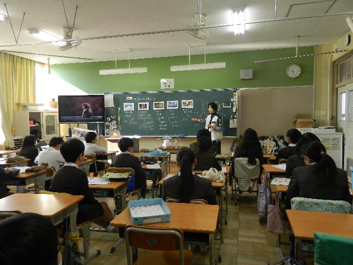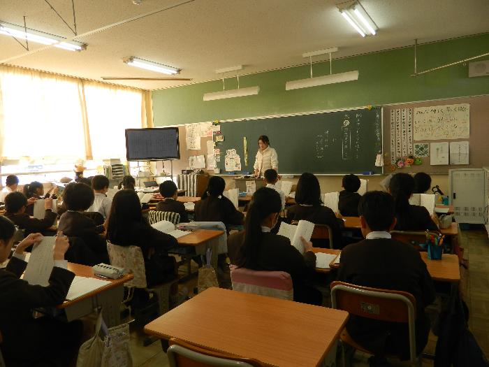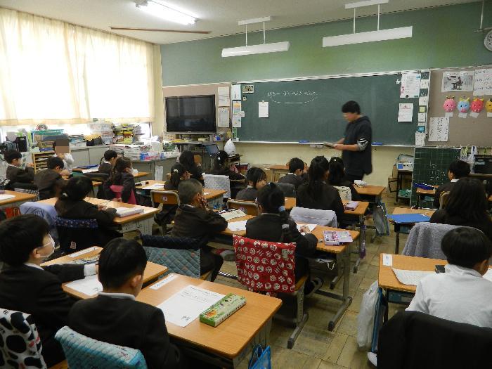 5年生家庭科の授業。「着方の工夫をしよう」をめあてに、季節や場所によって着るものを選ぶことやその注意点を勉強していました。しっかり説明を聞き、答えていました。