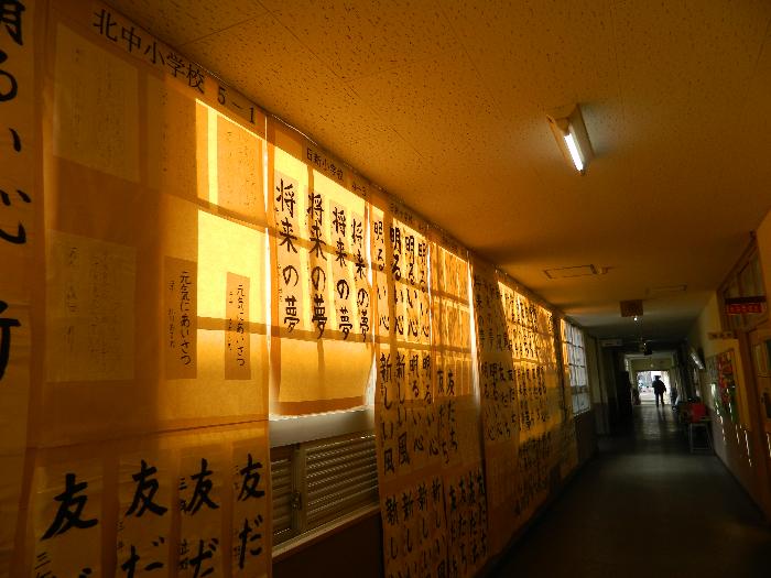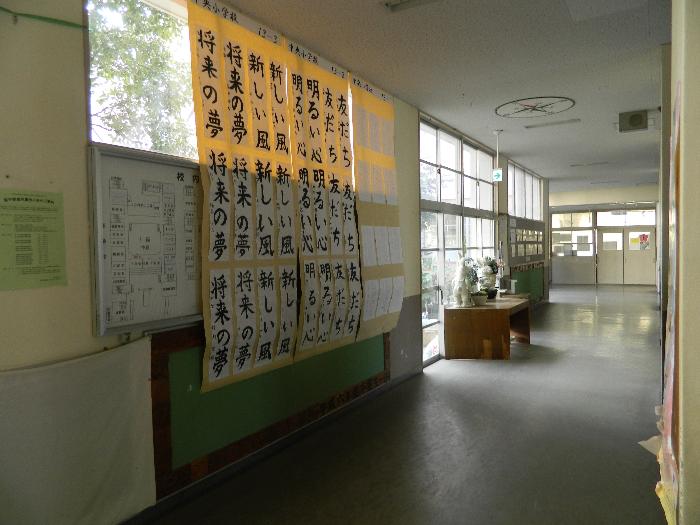 市内小学校で選ばれた書き初めが中央小学校に回ってきました。もちろん本校の作品もあります。子どもたちは足を止めてじっくり見ていました。