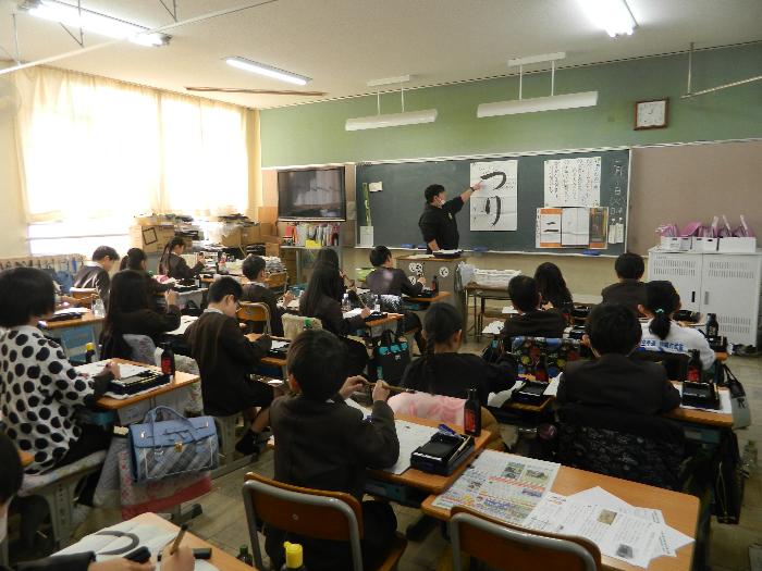 3年生書写の時間。毛筆で「つり」を書いていました。バランスが難しいです。