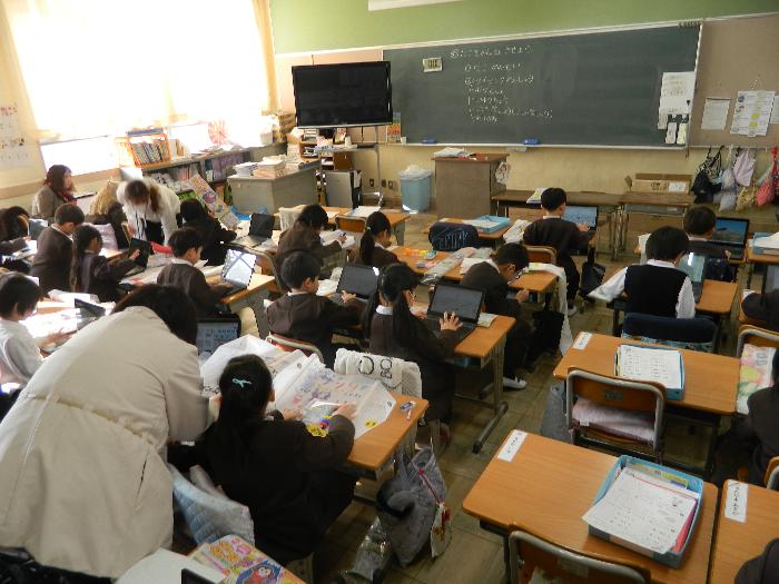 2年生国語の時間。デジタル教科書を使って音読をしていました。