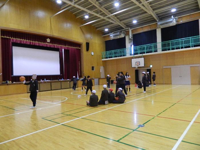 6年生体育の授業。体育館でバスケットボールをしていました。1対1をしているところは白熱していました。
