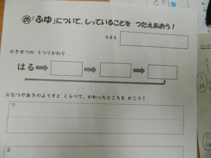 1年生生活の時間。はる、なつ、あき、ふゆ。季節の振り返りをプリントにかきこんでいました。