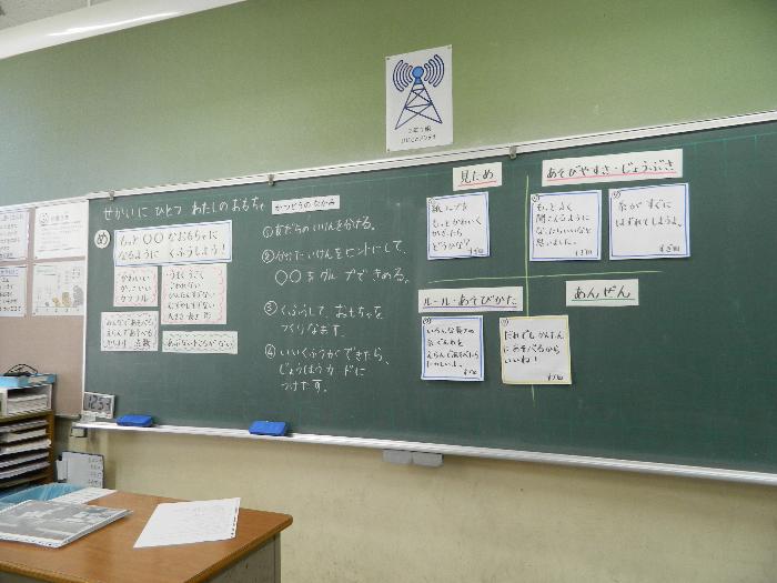 10月9日学校公開の時の2年生の授業。「もっと〇〇なおもちゃになるようくふうしよう」をめあてに授業が展開されていました。じぶんが気づいた工夫、課題をふせんに書きだし、4つの項目に分けた模造紙に貼っていきます。班で1枚模造紙を完成し、たくさん集まっている項目に注目します。