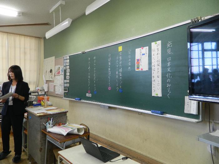 この日午後から学校公開をし、府下の学校から先生方に授業を見に来ていただきました。6年生は、日本の伝統文化に関わることを調べ整理分析し、外国と比べながら、その良さを発表していく授業を展開していました。この時は思考ツールを使いながら整理していました。