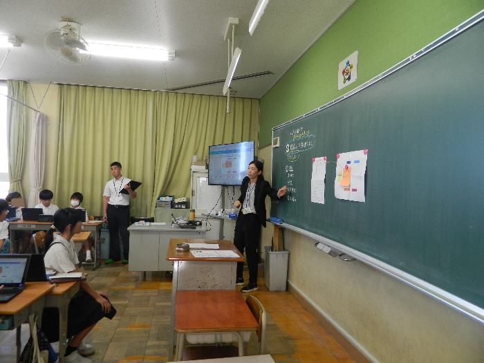 2年生公開授業。班で自分の書いた情報を4つの項目に分けて貼って集約しています。