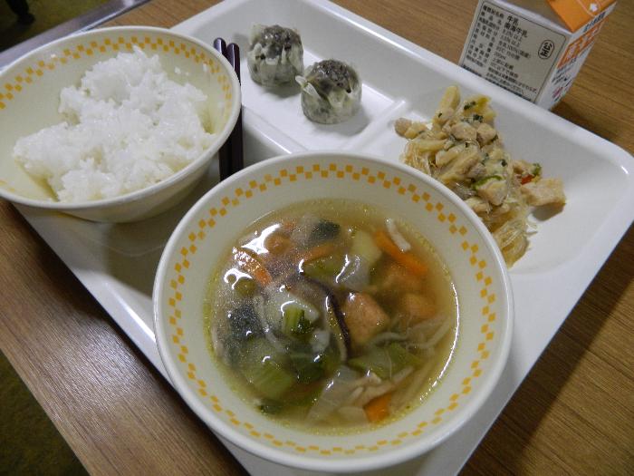 牛乳 ごはん チャプチェ 蒸ししゅうまい 中華スープ