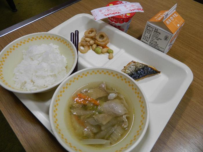 牛乳 ごはん 鯖のレモン醤油かけ 五目豆 沢煮椀 ヨーグルト(ソフール)
