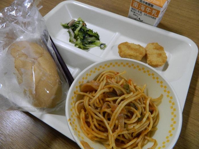 牛乳 ミニパン なすとベーコンのスパゲティ チキンナゲットの照り焼きソースかけ