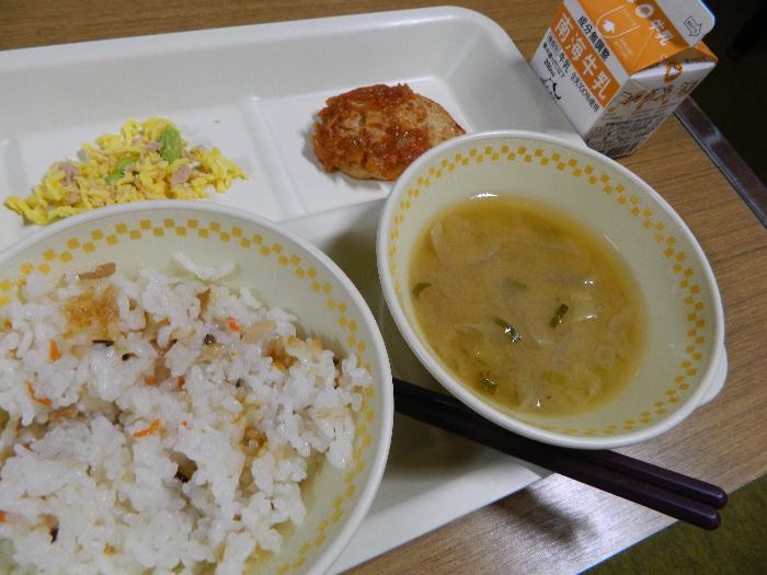 牛乳 卵とツナの祭り寿司 豆腐ハンバーグのおろし玉ねぎソースかけ さつまいものみそ汁