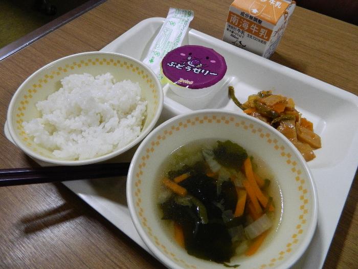 牛乳 ごはん 酢豚 ごま入りわかめスープ ぶどうゼリー