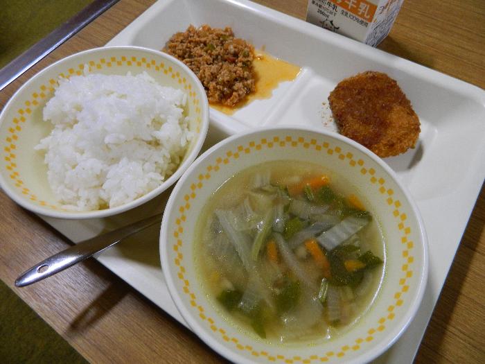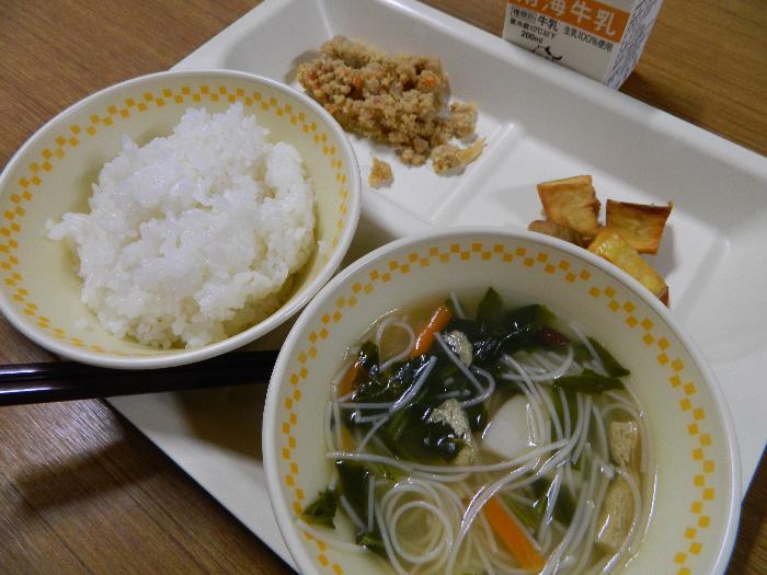 牛乳 鶏そぼろごはん 大学芋 にゅうめん汁