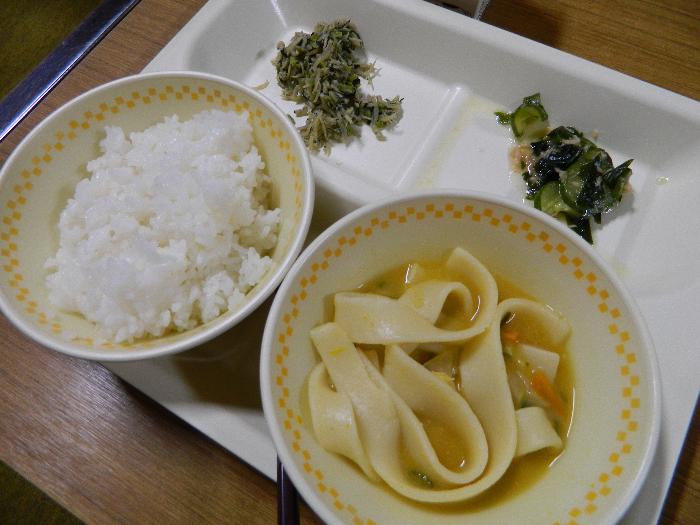 牛乳 ごはん ほうとう きゅうりとわかめの酢の物 手作りじゃこふりかけ