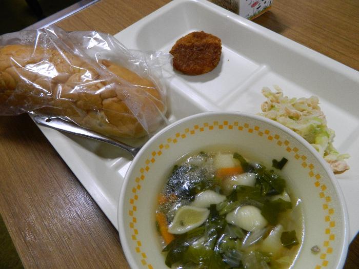 牛乳 さつまいもパン ミンチカツ キャベツのレモン醤油サラダ マカロニスープ