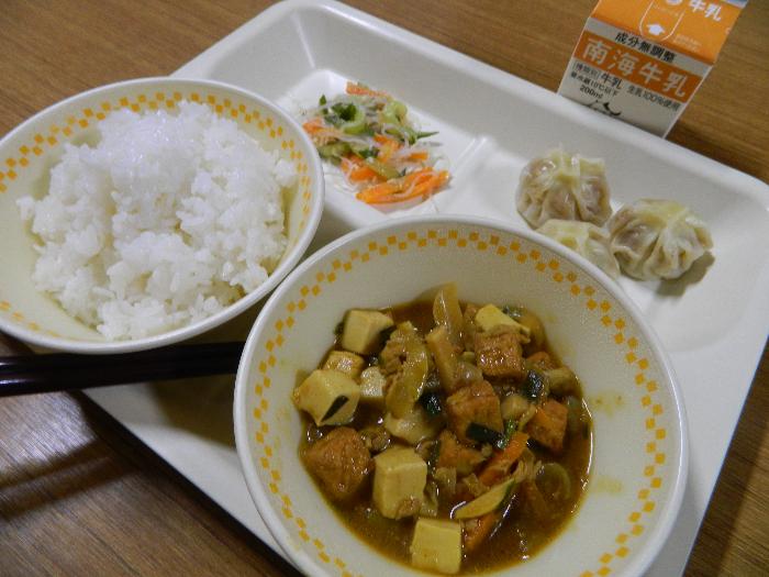 牛乳 ごはん カレー豆腐 ショーロンポー 春雨サラダ
