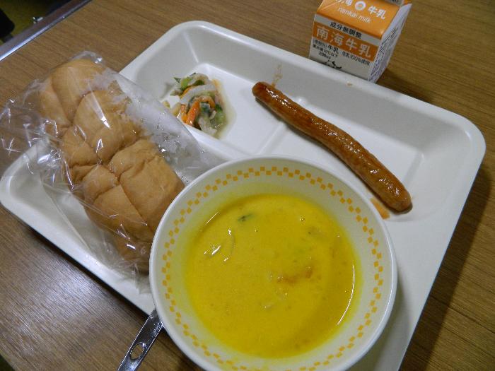 牛乳 ウインナードッグ 大根サラダ かぼちゃのポタージュ