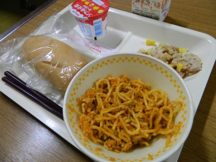 牛乳 ミニパン ミートスパゲティ ツナサラダ ヨーグルト(ソフール)