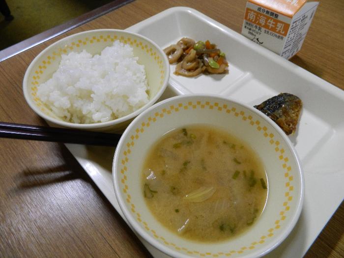 牛乳 ごはん 鯖の香味ソースかけ 根菜の金平 さつまいものみそ汁