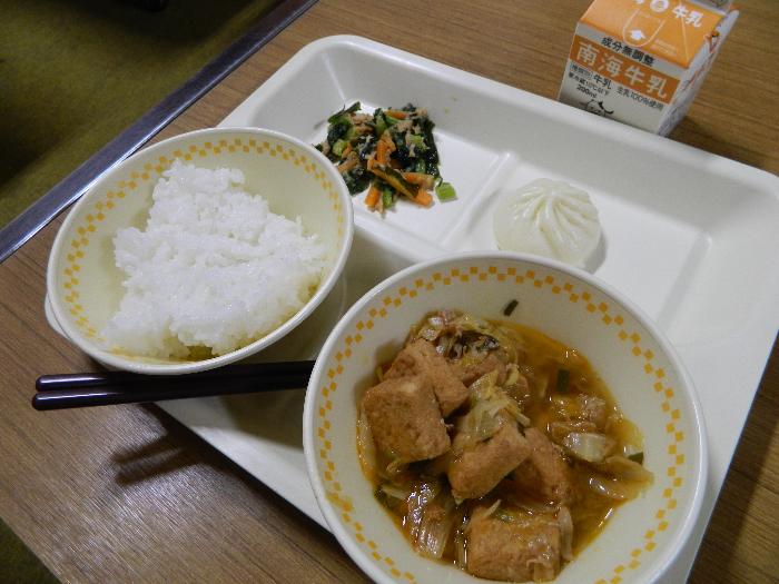 牛乳 ごはん 厚揚げチゲ ミニ肉まん わかめとツナのナムル