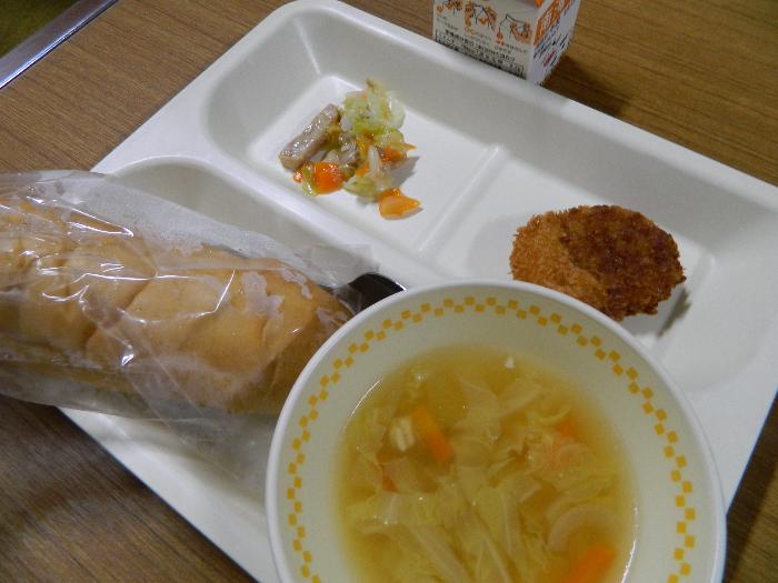 牛乳 パン コロッケ 厚切りベーコンとエリンギのソテー 塩レモンスープ