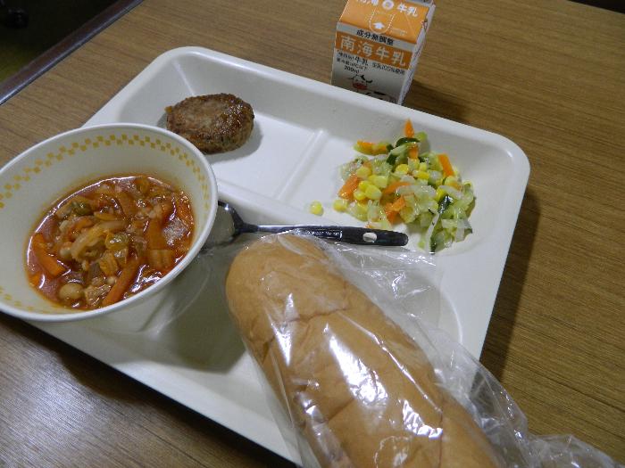 牛乳 パン ハンバーグのバーベキューソースかけ コーンサラダ ミネストローネ
