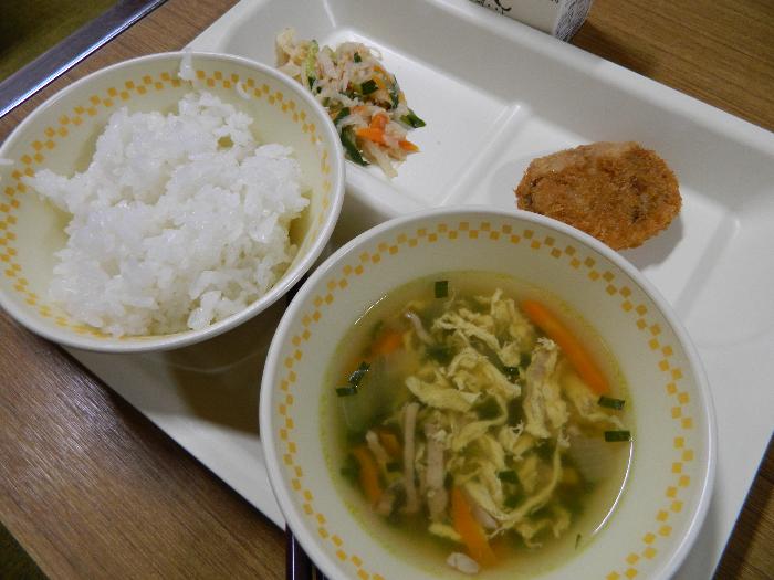 牛乳 ごはん かつおミンチカツ 切干大根の酢の物 にら玉スープ